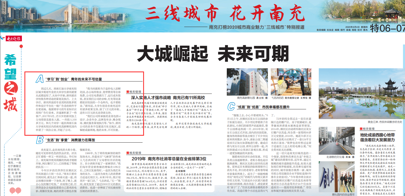 6月4日,南充晚報(bào)以《“學(xué)習(xí)”到“創(chuàng)業(yè)” 青年的未來不可估量》為題,報(bào)道了南充校區(qū)工程學(xué)院城鄉(xiāng)規(guī)劃2016級學(xué)生唐丙的創(chuàng)業(yè)故事。
