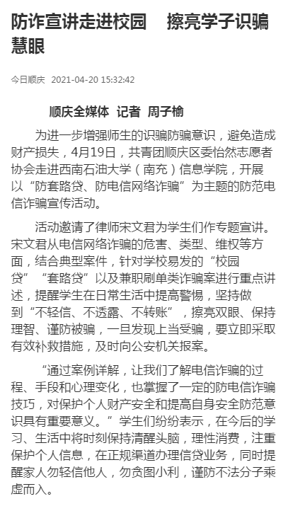 4月20日,順慶區(qū)政府官方微信公眾號(hào)“今日順慶”以《防詐宣講走進(jìn)校園 擦亮學(xué)子識(shí)騙慧眼》為題,關(guān)注報(bào)道了信息學(xué)院防范電信詐騙宣傳活動(dòng)。