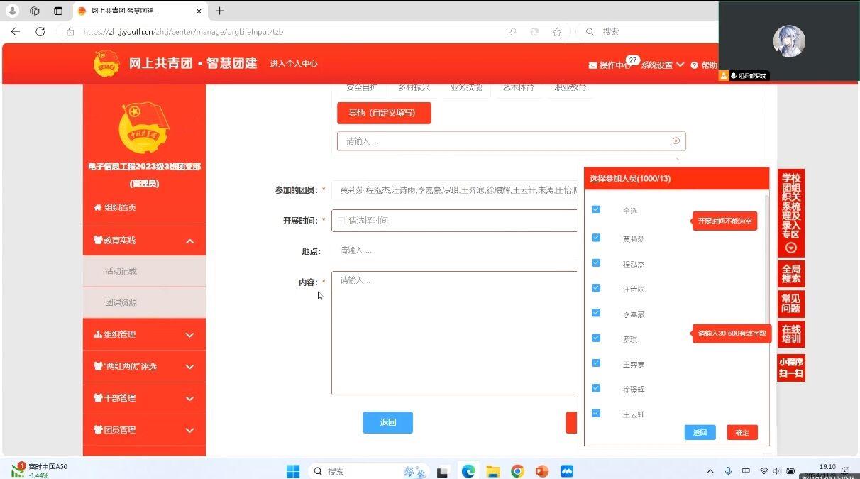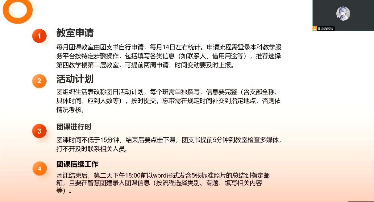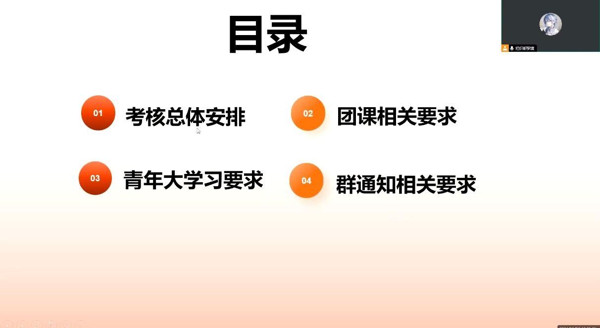 為提升電信院團(tuán)干部履職能力,并通過實踐使其熟練掌握團(tuán)支書相關(guān)技能,團(tuán)學(xué)分中心于11月9日晚線上開展團(tuán)支書培訓(xùn)會。本次培訓(xùn)會由考核總體內(nèi)容、團(tuán)課相關(guān)要求、青年大學(xué)習(xí)要求和群通知相關(guān)要求四部分組成。