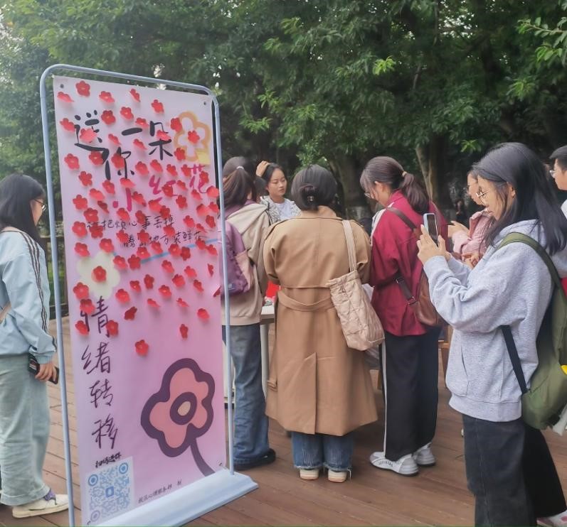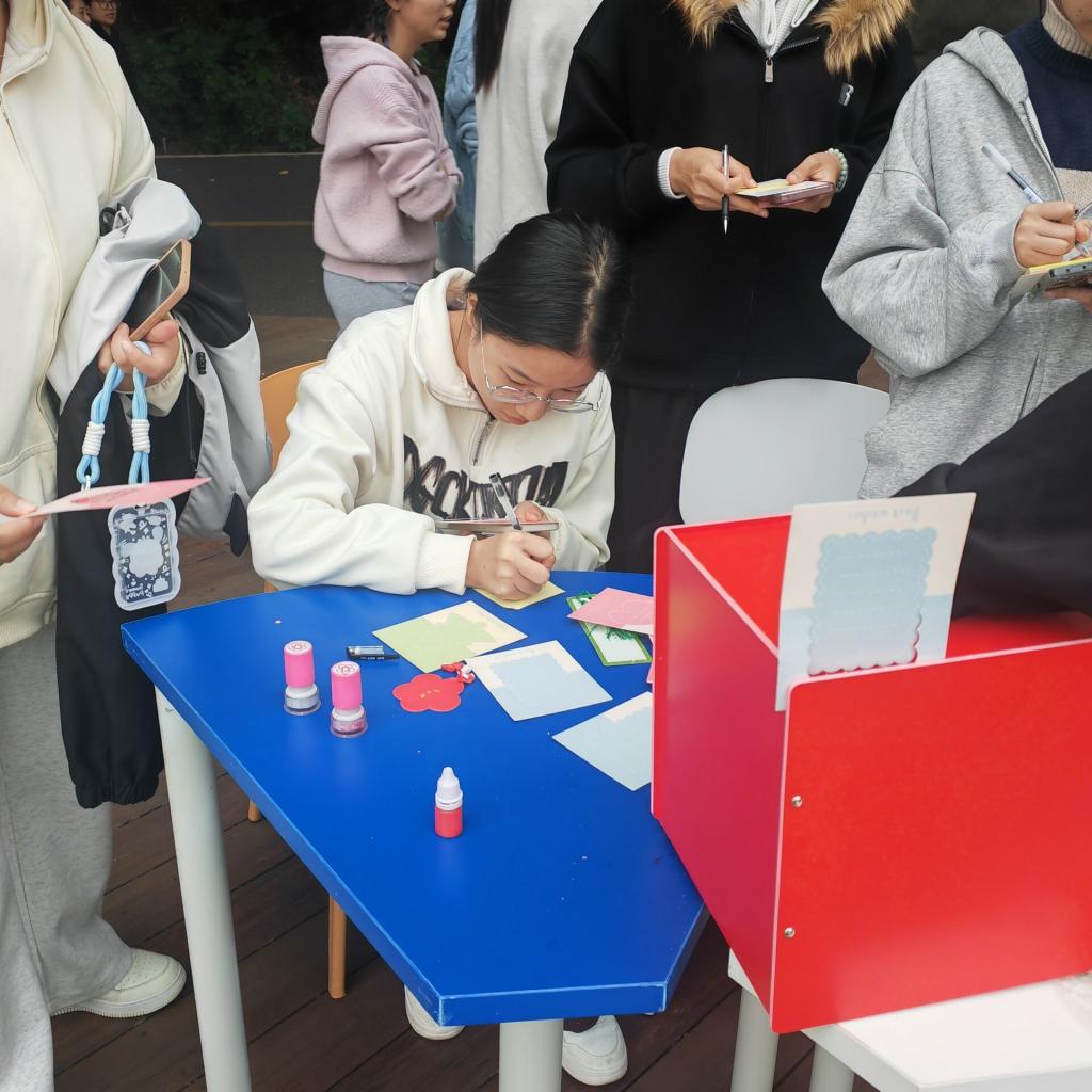 本次活動內容溫暖且形式多樣。學生們或抽取工作人員已準備好的暖心卡片,感受其滿滿的溫暖;或在空白卡片上寫下對他人的暖心祝愿,并蓋上小紅花放入盲盒中,等待抽取,將溫暖延續;或在小紅花便利貼上留下對自己或他人的鼓勵與期盼,感受被關懷的力量。此次活動不僅是一場簡單的互動游戲,更是一次心靈的交流和情感的傳遞。學生們以飽滿熱情的精神狀態參與其中,感受到被關懷的暖意包圍的同時,也在傳遞祝福的過程中收獲了快樂。