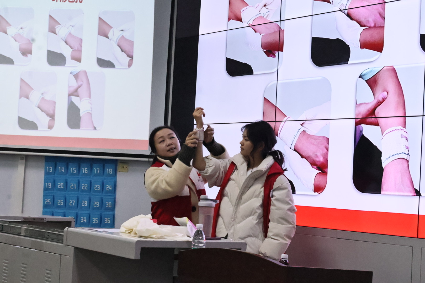 圖為老師進行傷口包扎示范