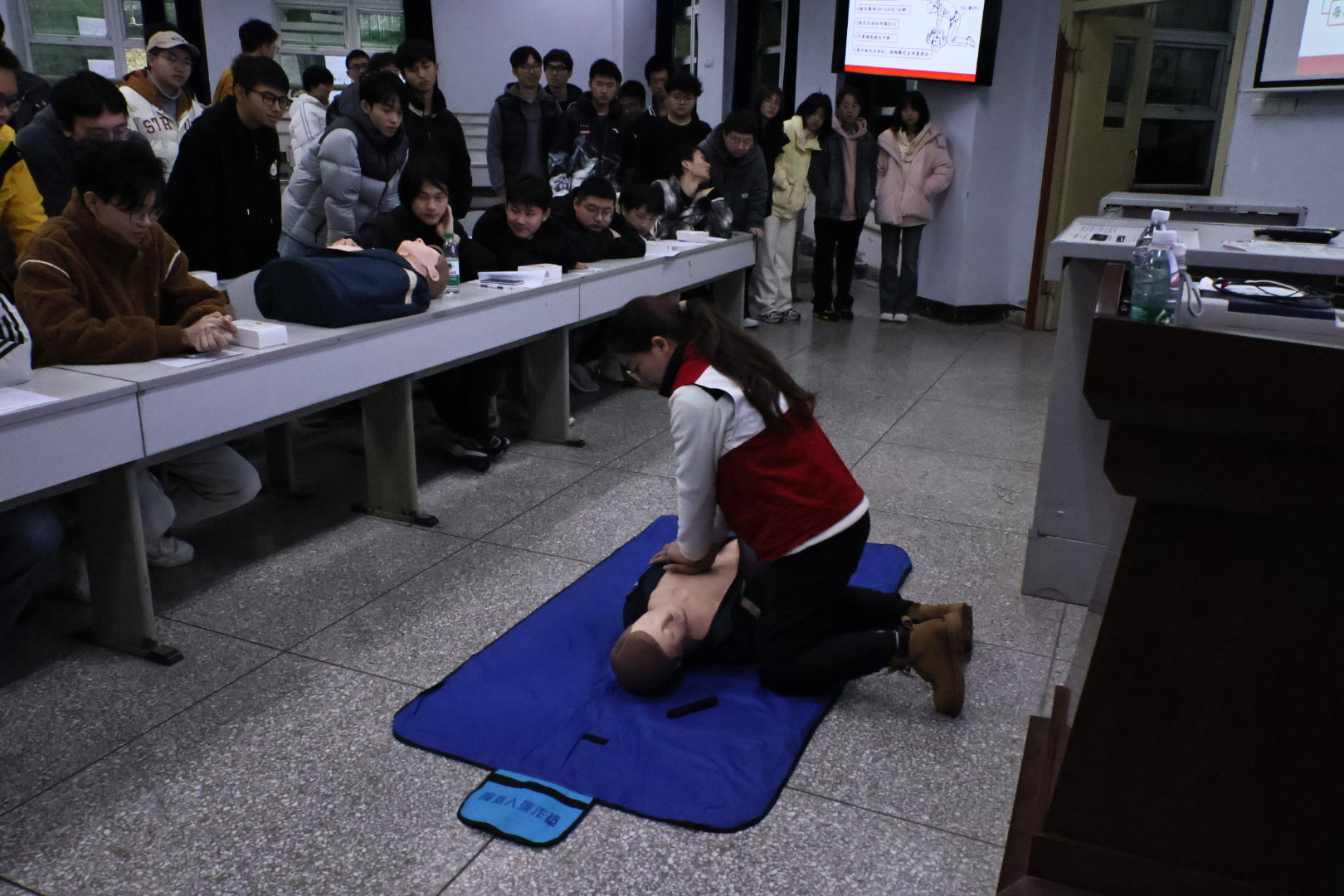 在培訓過程中,紅十字會的專業講師們通過深入淺出的理論講解和實踐操作,向學員們系統傳授了心肺復蘇、創傷救護以及常見急癥處理等至關重要的急救技能。同學們學習熱情高漲,全心投入,不僅認真研習了如何判斷患者意識和呼吸狀態,掌握了胸外按壓節奏與人工呼吸的配合技巧,還深入了解了精準止血、妥善包扎與有效固定骨折部位的方法,以及針對特殊傷害和燒燙傷的急救要點與應對措施。通過這些學習,同學們的急救能力得到了顯著提升。