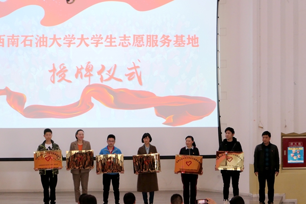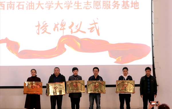 閉幕式上,郝江嶺向羅瑞卿故居紀(jì)念館、南充市心理行為康復(fù)中心等11家單位授予“西南石油大學(xué)大學(xué)生志愿服務(wù)基地”牌。南充市禁毒委員會、市公安局禁毒支隊向我校大學(xué)生禁毒志愿服務(wù)隊授牌,南充市紅十字志愿者協(xié)會向南充市紅十字志愿者協(xié)會西南石油大學(xué)分隊授牌。