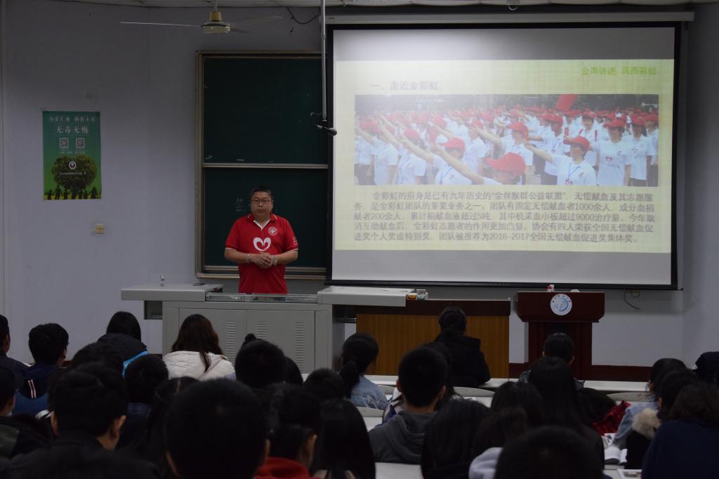 講座上,紅十字中心采血科陳瑧科長首先給同學們科普了血液對于醫療方面的重要性,陳述了獻血不僅能促進自身的新陳代謝,而且獻出的血液能夠挽救部分人的生命的優點,呼吁大家多多參加“三獻”為社會做出自己的一份貢獻。本次講座還邀請到了南充市金彩虹公益協會會長金高峰,高會長在講座上介紹了金彩虹公益協會的發展歷程,也分享了金彩虹作為一個自主管理、獨立發展、純粹的民間公益團隊的運作機制。其間,南充市無償獻血次數最多的記錄保持者冉素華也為同學們分享了她在公益事業中多年的所見所聞與自身的感受。講座最后,金彩虹公益協會黨支部書記張忠貴分享了自己從事公益并簽署遺體捐獻角質膜協議的經歷,張書記呼吁有更多的同學們能夠加入青年志愿者的隊伍中。