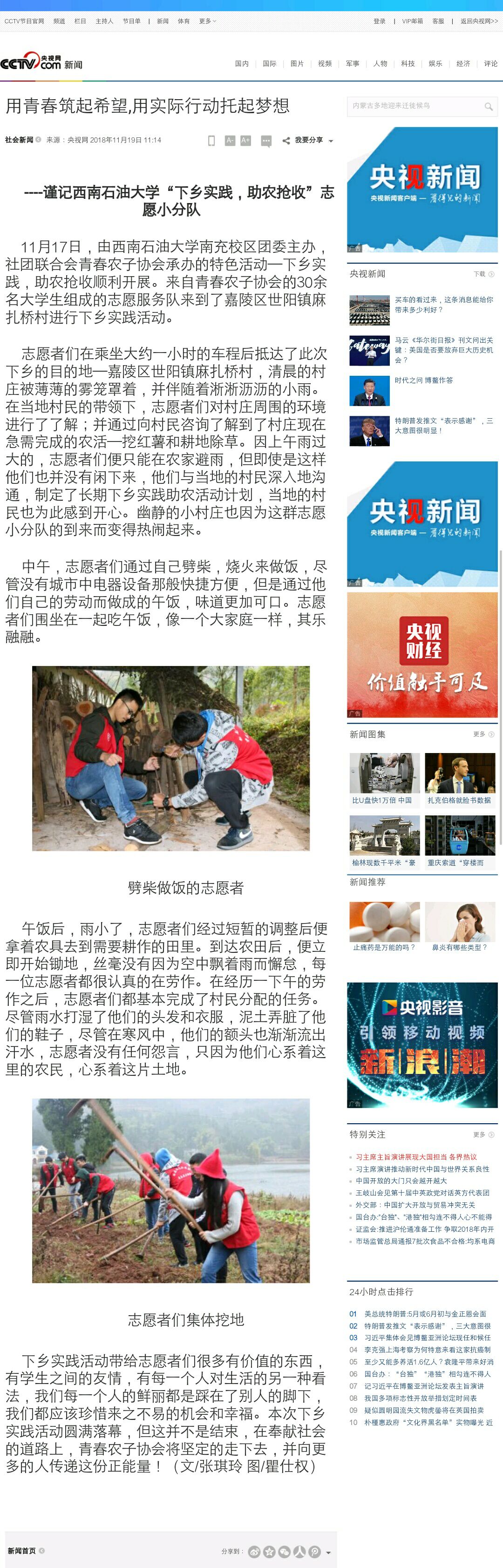 近日,央視新聞詳細報道了由校區團委主辦、社團聯合會青春農子協會承辦的“下鄉實踐,助農搶收”活動。該報道對青春農子協會“下鄉實踐,助農搶收”志愿小分隊活動行程進行了詳細跟蹤報道,引起社會各界的廣泛關注。