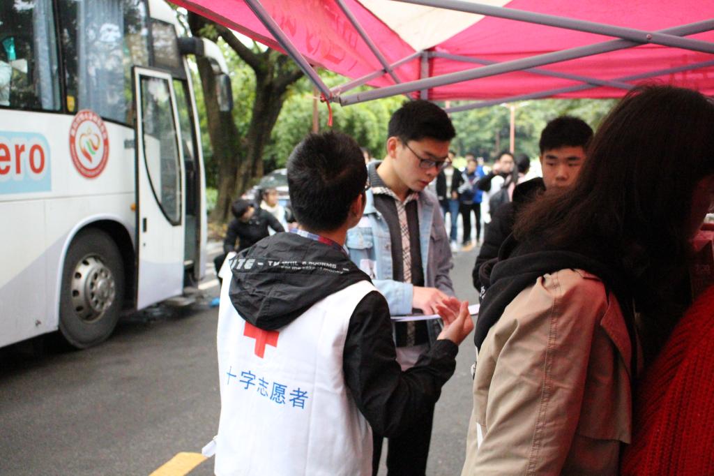 上午8點,紅協志愿者協會的理事投入工作,協助南充市血站工作人員井然有序地開展一系列檢查。上午9點,活動便吸引了大批同學前來報名。活動不到半個小時,獻血的同學已經排成長長的隊伍。南充市血站的工作人員為報名的同學做血型測試,之后獻血者登上大巴進行獻血。除此之外,在場的理事還紛紛向來往的路人發放了關于獻血、人體器官捐獻的宣傳單,為廣大師生普及三獻知識。