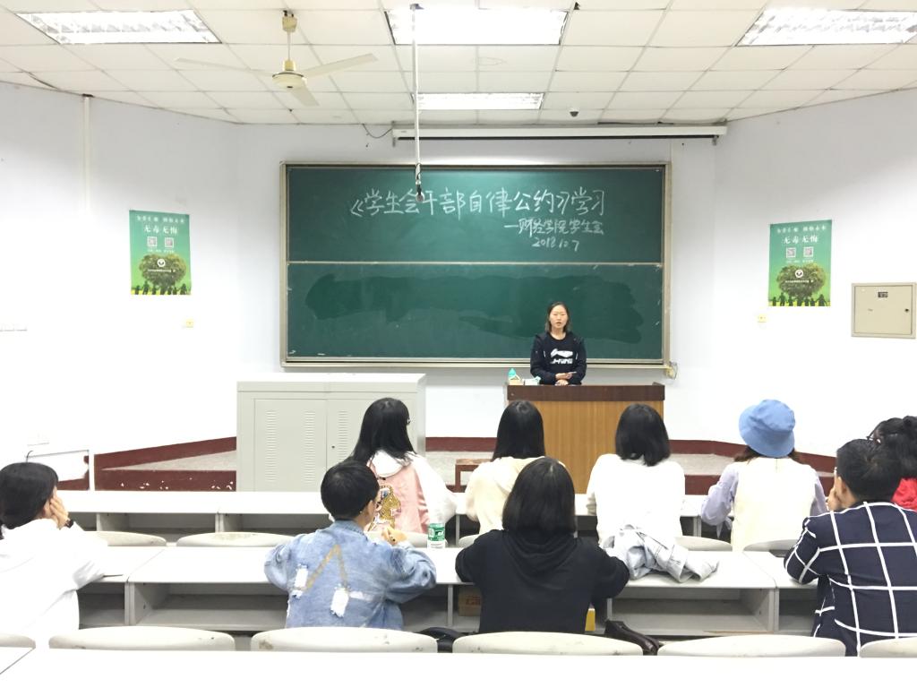 為響應四川省教育考試院堅決反對“官”本位思想和作風的號召。10月7日晚,財經學院學生會開展了“學生干部自律公約”的學習活動。