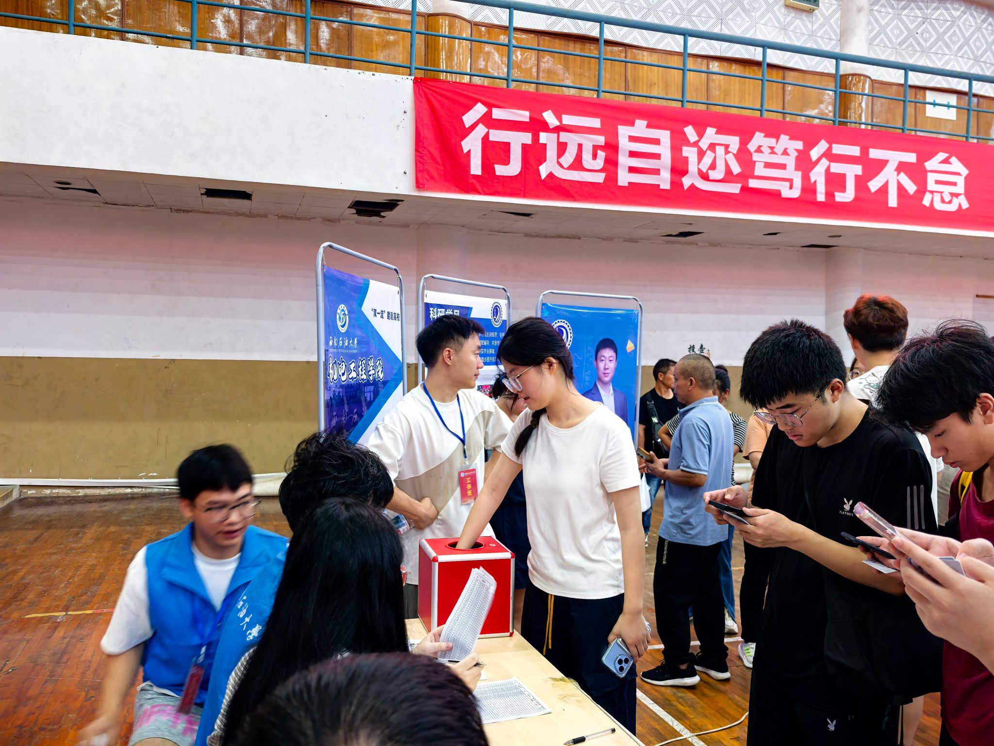 機(jī)電院在體育館內(nèi)設(shè)置新生報到處,組織志愿者團(tuán)隊協(xié)助新生完成身份核驗、材料提交等流程;圍繞新生關(guān)心的課程學(xué)習(xí)、生活須知等問題答疑;現(xiàn)場還準(zhǔn)備了實用扇子和學(xué)院宣傳冊的迎新禮包,并設(shè)有抽獎環(huán)節(jié),以輕松方式拉近彼此距離。此外,學(xué)院精心策劃了多元迎新活動,設(shè)置多處打卡點(diǎn),幫助新生快速融入校園。如體育館“請留下你的笑臉”的鼓勵新生通過自畫像傳遞正能量;宿舍樓下的“請與我擊掌”以跨越時空的擊掌傳遞溫暖與鼓勵地質(zhì)樓以“我在機(jī)電工程學(xué)院很想你”網(wǎng)絡(luò)熱梗標(biāo)語,讓新生直觀感受實驗室科創(chuàng)氛圍。機(jī)電院副院長蔡燦親臨迎新現(xiàn)場,與學(xué)生及家長親切交談介紹學(xué)院概況和學(xué)習(xí)內(nèi)容,鼓勵同學(xué)們積極融入校園、適應(yīng)大學(xué)生身份。
