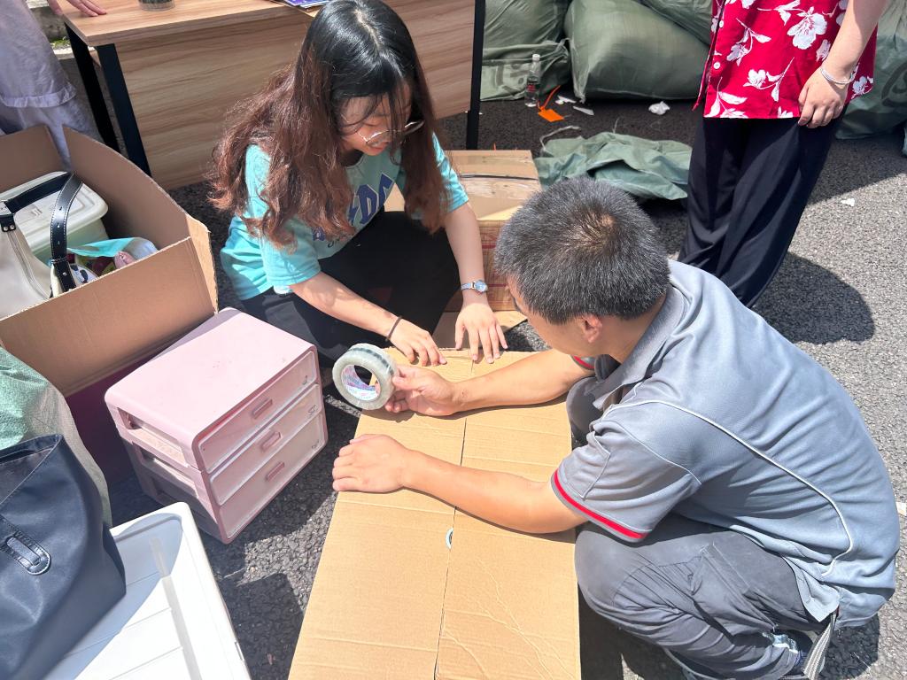 一大早,黨員志愿者們根據前期收集到的畢業生需求信息,早早的來到他們的寢室,幫助他們整理、打包、搬運行李。黨員志愿者們兩兩一組,分工明確,互相配合,協力把沉重的行李從寢室搬至學校門口,大大小小的物品,來回忙碌的身影,汗水浸濕的衣衫,充分展現了他們不怕臟、不怕苦、不怕累的精神風貌。黨員志愿者們冒著烈日穿梭在校園的各個角落,把母校的關懷傳遞給即將離校的畢業生們,也讓他們切實感受到母校的溫暖。