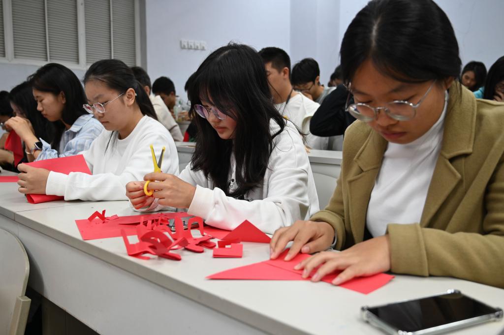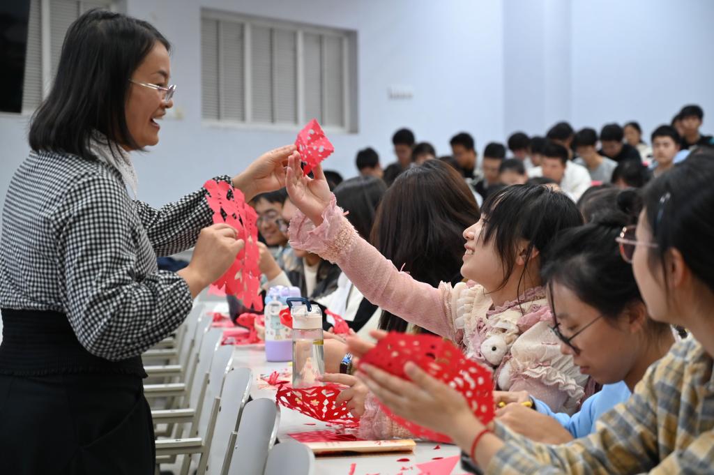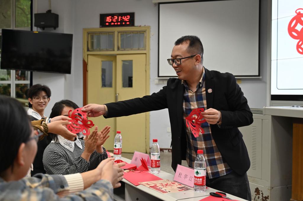 活動開始,杜華江向同學們介紹了剪紙藝術的源起、演變以及其獨特的技藝精髓,并在現(xiàn)場演繹了剪紙創(chuàng)作流程。隨后,杜華江向同學們展示了剪紙傳承人們的典范作品及創(chuàng)新佳作,并逐一闡釋作品的文化內(nèi)涵與藝術構想。最后,杜華江帶領同學們參與剪紙,創(chuàng)作出了極具個人特色的剪紙作品,讓同學們在動手實踐中感受非遺文化的魅力。