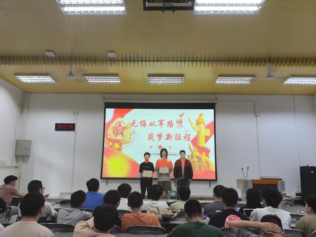 會上,魯廣航結合應征入伍的意義、征兵政策、退役后職業發展、經濟補助等全方位向應征意向畢業進行了詳細介紹,并號召應征意向畢業生積極響應號召,參軍入伍,主動承擔新時代青年的責任與使命。隨后,學院退役大學士兵優秀代表電氣工程與智能控制2022級的歐陽安南和電氣工程與智能控制2023級的周武向同學們分享了他們在部隊的日常生活與軍事訓練。最后,魯廣航向兩位代表頒發電氣信息學院2025年“征兵宣傳推薦官”聘書。