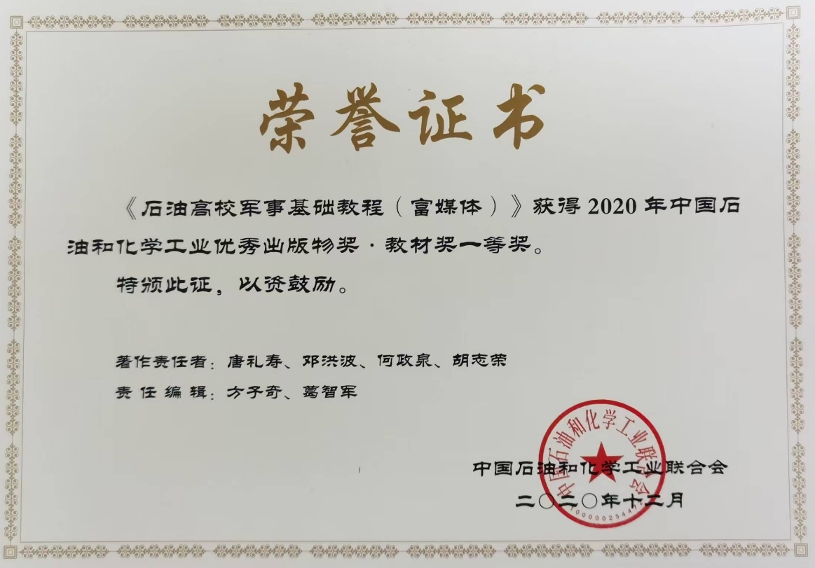 10月23日,我校軍事教研室收到中國石油和化學工業聯合會寄來的榮譽證書。該教研室唐禮壽教授等主編的《石油高校軍事基礎教程(富媒體)》獲2020年中國石油和化學工業優秀出版物獎·教材獎一等獎。