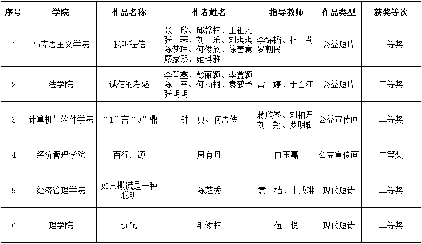 馬克思主義學(xué)院學(xué)生張欣、邱馨楠、王祖凡等攝制的作品《我叫程信》獲得公益短片一等獎。該片講述了校園自媒體博主程信在發(fā)現(xiàn)同學(xué)通過發(fā)布虛假信息以騙取流量的行為后,成功勸說對方改正錯誤的故事,彰顯了誠信做人、誠實做事的鮮明主題。另有5件學(xué)生作品分獲公益短片、公益宣傳畫、現(xiàn)代短詩類作品二、三等獎。