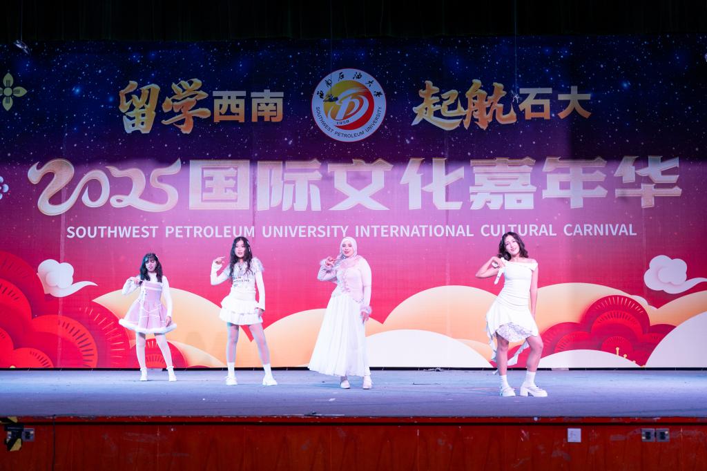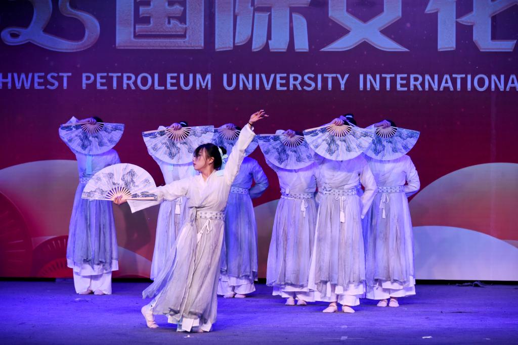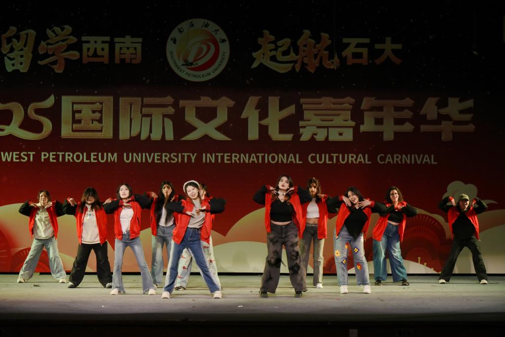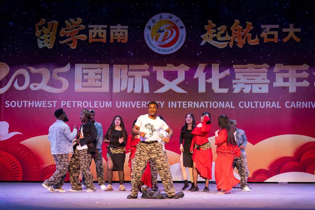 暖場節目的樂隊演奏將美妙的音樂變化為溝通的橋梁,連接了每一位到場的觀眾。歌曲《愛如潮水》《風吹麥浪》,配以樂隊的現場演奏,共同演繹出經典歌曲的飽滿深情。現代舞《浪漫舞步(LUV)》,融入多樣元素,展現了同學們朝氣蓬勃的青春風貌。舞蹈《你好嗎(Comment ?a Va)》,通過熱情洋溢的非洲舞蹈,展現了國際學生的活力,也傳遞出非洲文化的獨特魅力。川劇《巴蜀神韻》以其神秘莫測、變化無窮的特點,讓國際學生領略了中華優秀傳統文化的魅力及其藝術特色。語言分享節目《我在石大的日子》,通過與振華石油公司員工和振華石油項目優秀研究生同學的對話,分享了學生在石大的學習生活和收獲體悟,引領國際學生踔厲奮發、勇于創新。中外學生聯袂演繹的新疆舞《畫中花》,用靈動的舞步、俏皮的眼神和飛揚的裙擺,展現出獨特的地域風情和文化魅力。器樂演奏和舞蹈相融合的節目《新十面埋伏》,通過打鼓的鏗鏘、二胡的哀婉、笛葫的纏綿、古箏的清脆及舞姿的柔美,共同描繪出中國傳統器樂和舞蹈的無限美麗。科技感滿滿的電光舞《電光之夜,點亮校園》,結合炫酷的光影效果,呈現出一場充斥著未來感的視覺盛宴。由中國學生傾情呈現的古典舞《史箋舞韻》,伴著悠揚的古樂,九位舞者化身女史官,輕盈的身姿、靈動的舞步,翩翩起舞。歌伴舞《旗開得勝(Waving Flag)》,節奏明快、氣氛火熱,表達了世界人民團結友愛的美好愿景。中外學生合唱的《相親相愛一家人》,以動人的旋律和溫暖的歌詞,傳達出濃厚如家人般的情誼。壓軸街舞《歡樂頌》,歡快的旋律和熱烈的舞步,將中外學生匯聚到一起,盡情釋放青春的活力。