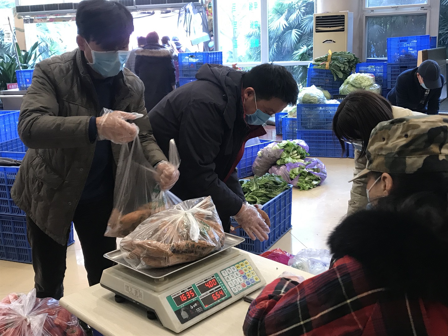在分裝現場,志愿者們經過體溫測量,佩戴一次性手套進入工作區域,搬運組將一袋袋、一箱箱新鮮蔬菜從車上卸下來,分裝組完成對蔬菜的分裝及打包,過秤組將蔬菜進行稱重打碼,歸置組將過秤后的蔬菜重新放回蔬菜箱,等候售賣,各環節操作規范,現場有條不紊。