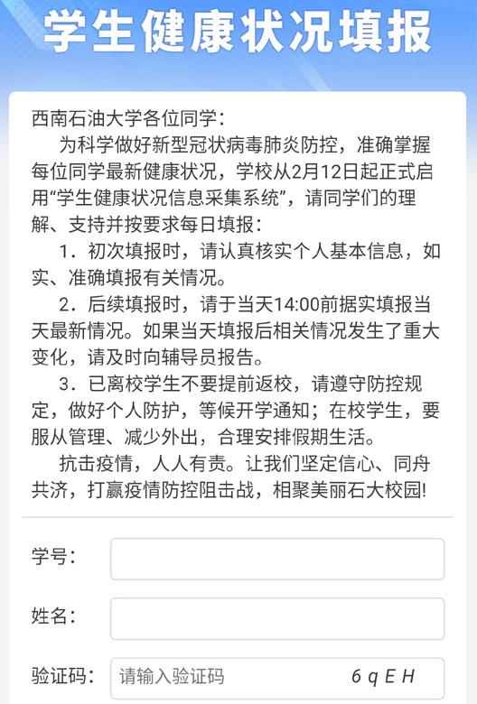 “同學們好,新冠肺炎疫情防控形勢依舊嚴峻,學校非常關注大家的身體情況,請每天14時前填報健康狀況……”昨天上午,各學院輔導員在QQ群、微信群、電話發布了這樣一則通知,提醒、督促學生登錄“疫情防控學生健康狀態填報系統”填報當日健康狀況。
