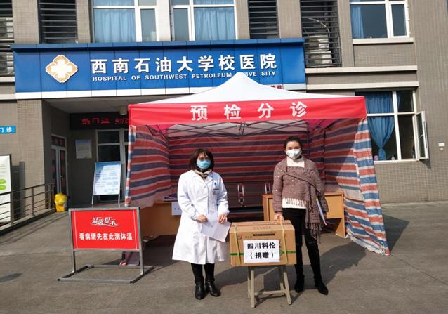 同一天,四川科倫藥業股份有限公司代表孫丹丹將公司生產的80瓶聚維酮碘溶液(碘伏)捐贈給校醫院。碘伏可殺滅細菌繁殖體、真菌、原蟲和部分病毒。
