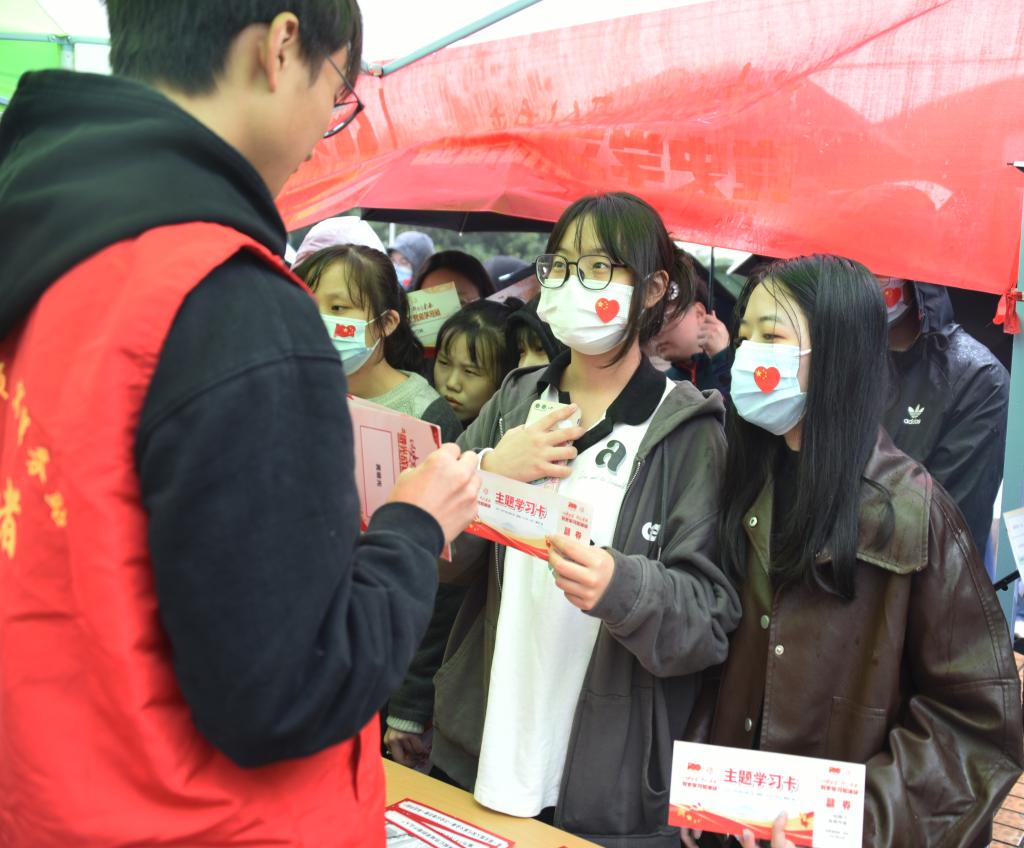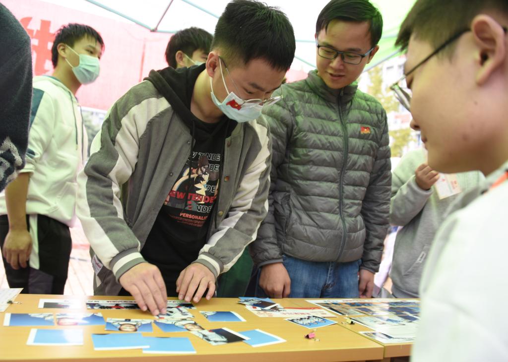 現場設有黨史大事記主題展、支部建設成果展等四大展覽區。活動區按不同歷史時期劃分了四大黨史主題,“開天辟地” “偉人詩詞飛花令”“改革大闖關”“‘話’說新時代”“‘拼’出新征程”“推翻三座大山”等八項黨史體驗項目同步進行,同學們手持闖關集章卡,將五星紅旗臉貼粘在胸前或臉上,在各個項目點位前排隊等候挑戰,前后左右交流黨史學習心得,不時傳來陣陣歡聲笑語。