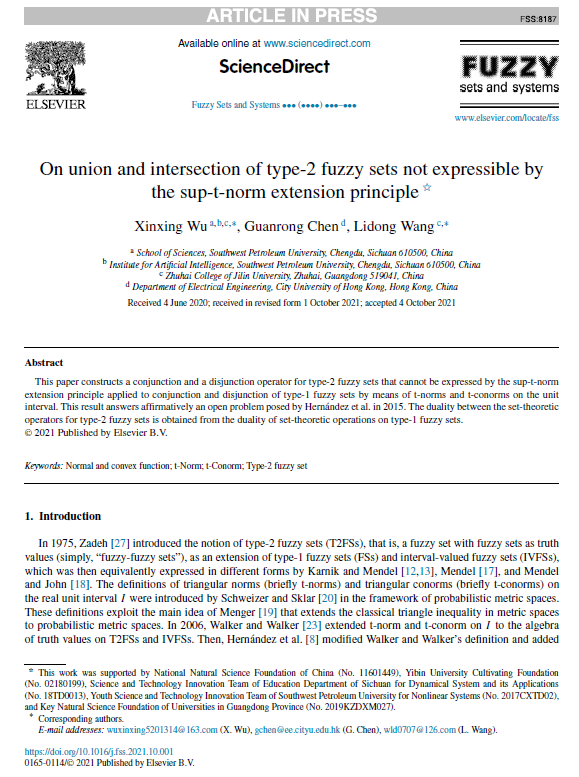 理學院青年教師吳新星教授歷時三載構造了一類非卷積形式的二型三角模,肯定地回答了國際知名學者P. Hernandez,S. Cubillo,C. Torres-Blanc于2015年在模糊數學應用研究頂級期刊IEEE Transactions on Fuzzy Systems(計算機科學一區Top期刊)提出的公開問題(OpenProblems),該結果發表在最近一期模糊數學理論研究最高期刊《Fuzzy Sets and Systems》(模糊集與系統,數學類Top期刊),吳新星為本文第一作者兼通信作者。