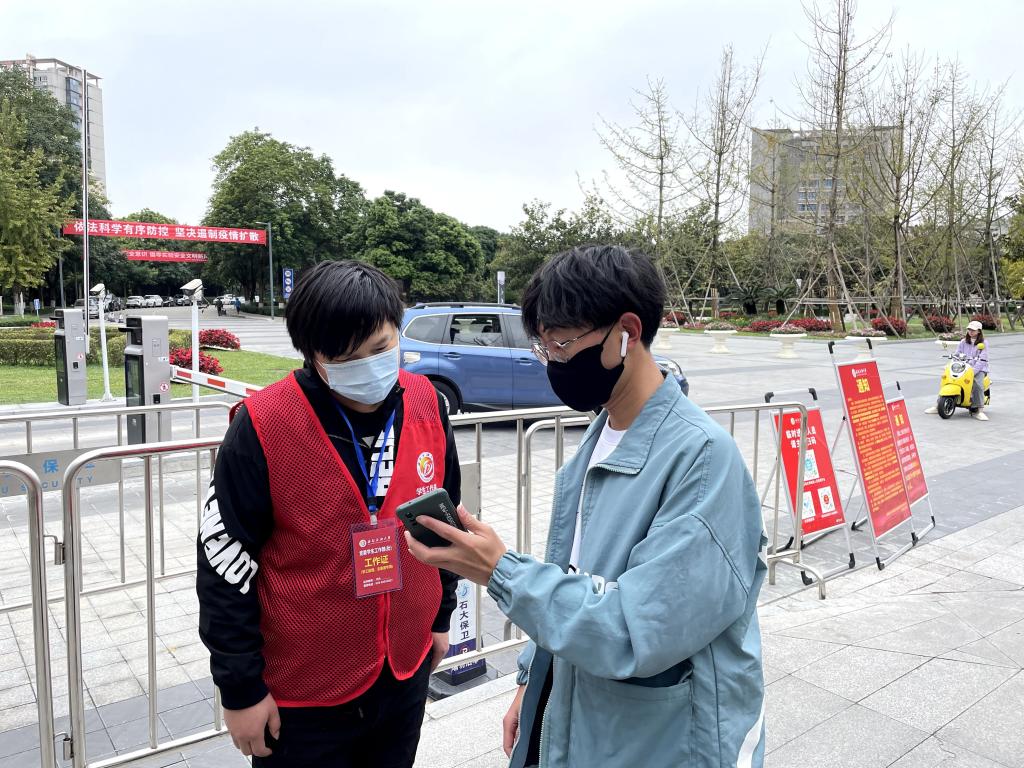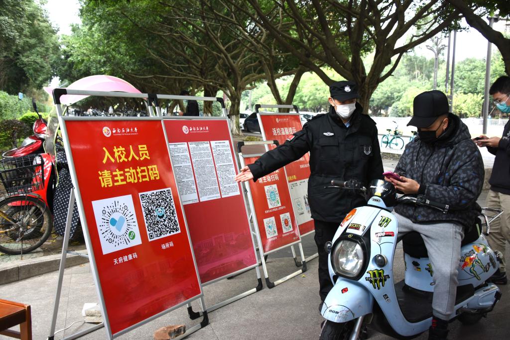 保衛工作人員引導學生出示證件、掃描場所碼進校