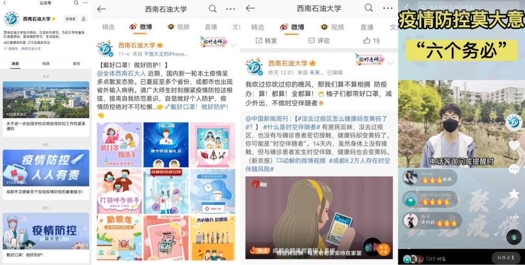 黨委宣傳部統籌抓好全校疫情防控新聞宣傳、輿論引導等各項工作,廣播站實施疫情應急值班制度。通過視頻、圖文等形式在微博、微信、抖音、快手、網站等學校官方媒體平臺上,持續推送疫情防控工作要求和疫情防護知識等,引導廣大師生自覺遵守疫情防控要求,做好個人防護,形成多形式、全時段、全覆蓋的宣傳引導態勢,凝聚起戰“疫”正能量。(資料由各單位各學院提供)
