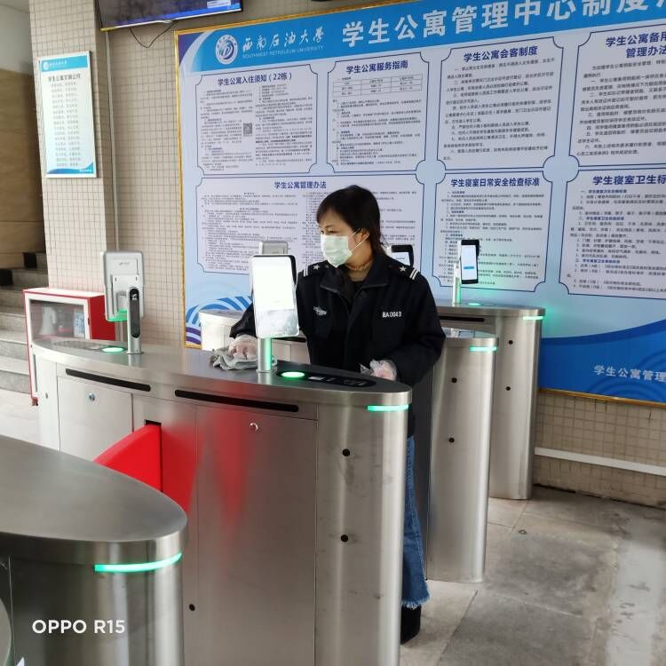 疫情就是命令,防控就是責任。后勤服務總公司嚴格執行24小時門崗管理,重點做好教工小區西小門、科技園區門禁管理,所有人員進校時必須經過校園一卡通身份核驗、健康碼核查、場所碼核查(核驗)和體溫檢測全覆蓋。杜絕校外無關人員和非綠碼者進入校園。嚴格管理所轄職工及合作商家的健康碼、體溫檢測工作,嚴格做好人員排查、門崗管理和請銷假制度,嚴格做實個人防護舉措,非必要不離蓉。餐飲中心對所有食堂加強消毒,實行“一米線”距離排隊,加強對冷凍食品的安全管理,對食堂供應商家嚴格執行佩戴口罩、查看健康碼。學管中心加大公共區域消毒力度、門禁管理和宿管人員檢查力度,一旦發現發熱、干咳、乏力等癥狀的同學,第一時間進行通報。綠化環衛中心召開疫情防控緊急會議,安排部署校園殺毒滅菌工作,做好人員健康監控與排查,建好每日監管臺賬。物管中心加大小西門的管理,堅決做到亮碼、亮卡、測體溫。