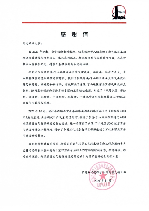 近日,中國石化勘探分公司向我校發來感謝信,感謝我校趙金洲教授帶領的頁巖氣壓裂技術研究團隊攻克了東溪-丁山地區深層頁巖氣壓裂難題,為東溪-丁山地區深層頁巖氣勘探突破做出的重大貢獻。