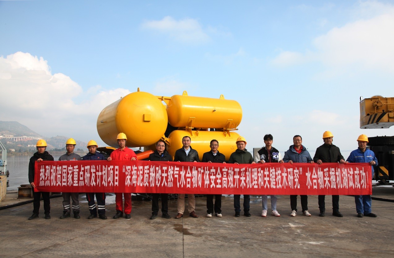近日,我校牽頭承擔的國家重點研發計劃項目“深海泥質粉砂天然氣水合物礦體安全高效開采機理和關鍵技術研究”順利完成水合物智能采掘以及噴射破碎、分離、輸送機具的海試、湖試與陸地井試驗,試驗結果達到并部分超出科技部考核指標要求。