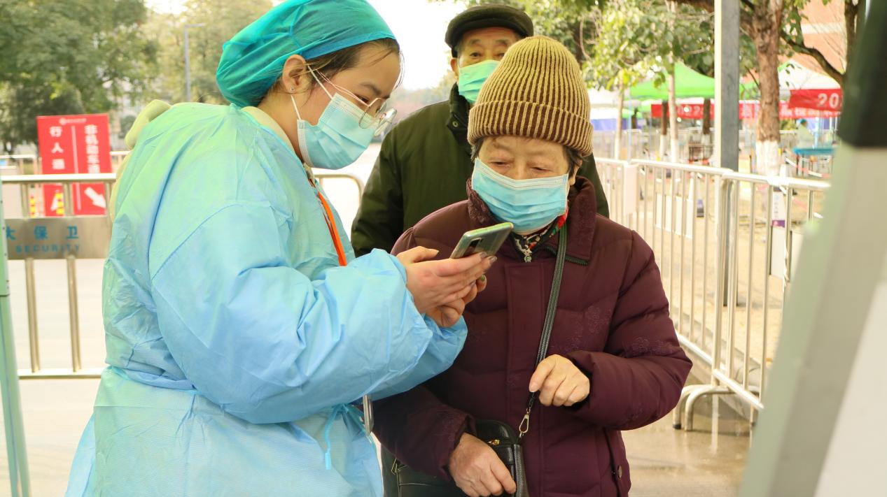 學生志愿者幫助老人掃場所碼