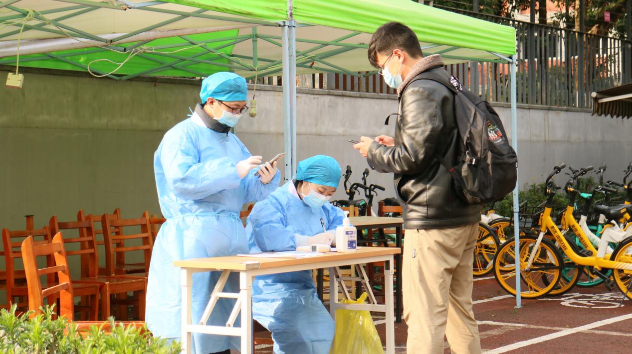 演練中,返校驗碼人員在掃碼等候區發現學生健康碼為“黃碼”后,立即向應急醫療處醫務人員報告;身著隔離服的醫務人員將“黃碼”學生帶離人群,至異常情況處置點登記相關信息,并查驗行程卡,詢問得知該“黃碼”學生返校途徑地升級為中風險地區后,立即向疫情防控聯絡員報告,并報告學校疫情防控管理員、社區疫情管理聯絡員,安排專車送學生前往新都區黃碼人員檢查點做核酸檢測,檢測后返校到集中留觀點居住,按照成都市社區防疫管理措施執行。