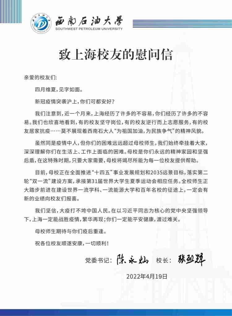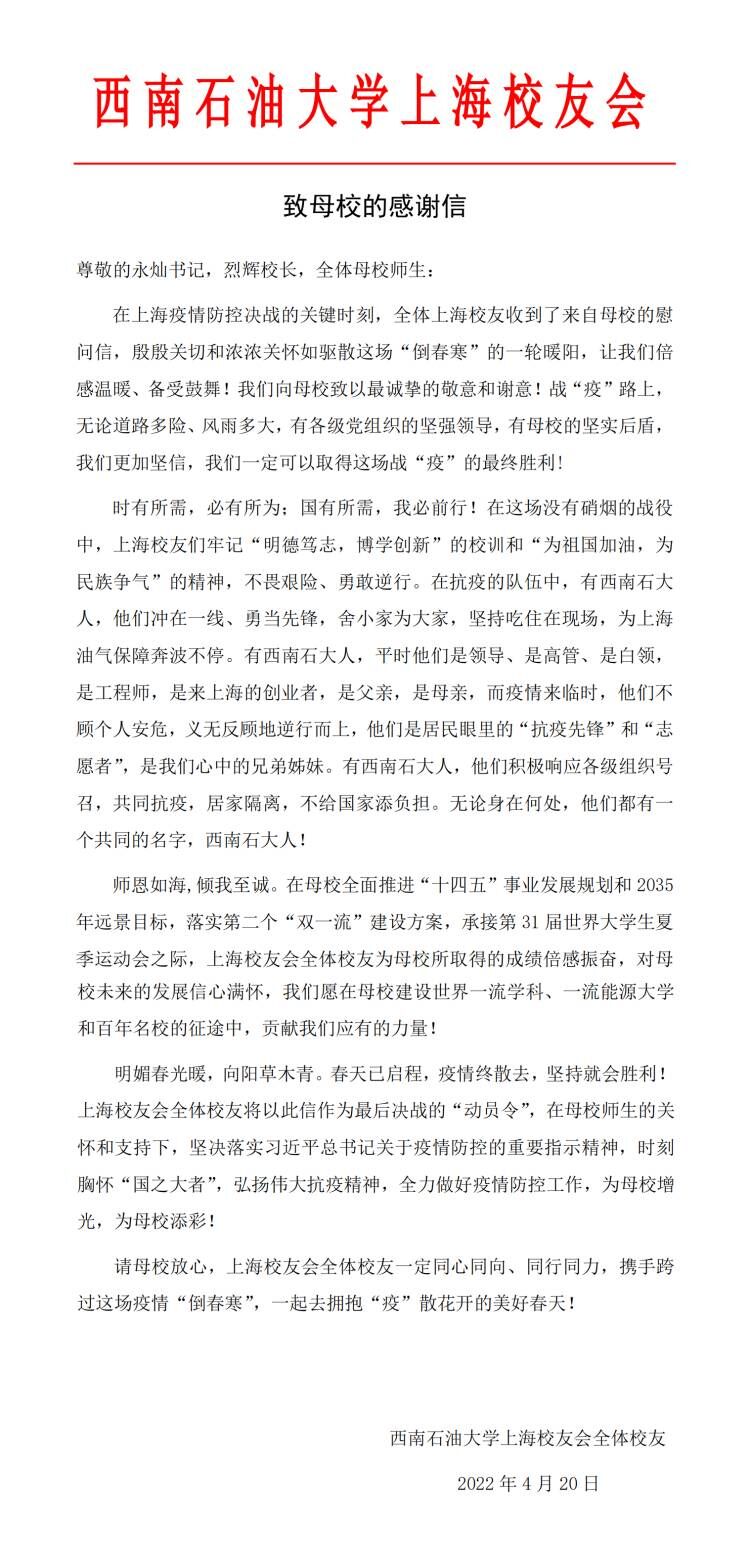 今日,西南石油大學(xué)上海校友會(huì)在收到校黨委書(shū)記陳永燦、校長(zhǎng)張烈輝昨天發(fā)出的慰問(wèn)信后,給母校發(fā)來(lái)一封感謝信,對(duì)母校給予上海校友的想念、關(guān)懷表示衷心感謝。感謝信情真意切,表達(dá)了校友們與母校的深厚感情,表現(xiàn)了校友們戰(zhàn)勝疫情的信心。全文如下。