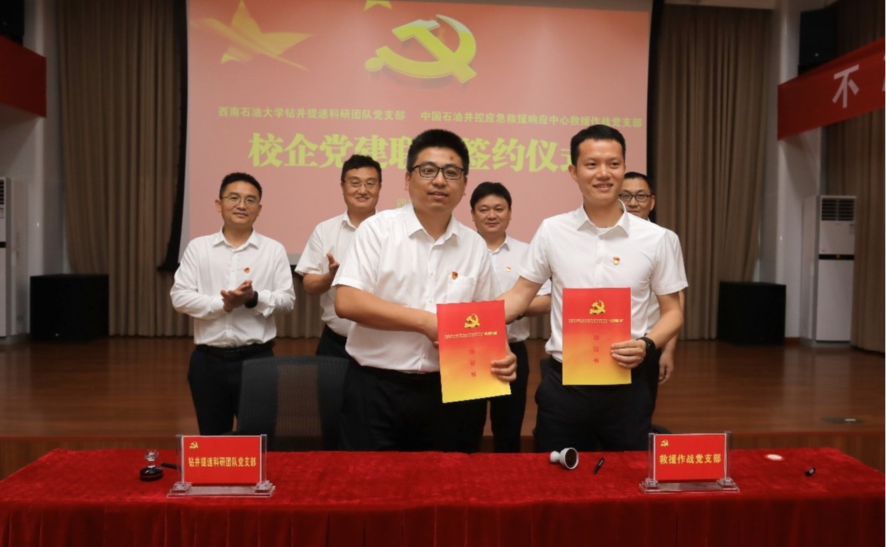 機電院黨委書記李忠偉、院長祝效華、鉆井提速科研團隊黨支部書記石昌帥及支部黨員代表前往中國石油集團川慶鉆探工程有限公司參會;井控應急救援響應中心代主任、代黨委書記羅園,副書記向曉彥,組織部部長周安文,救援作戰黨支部書記卿玉及支部黨員代表參會。