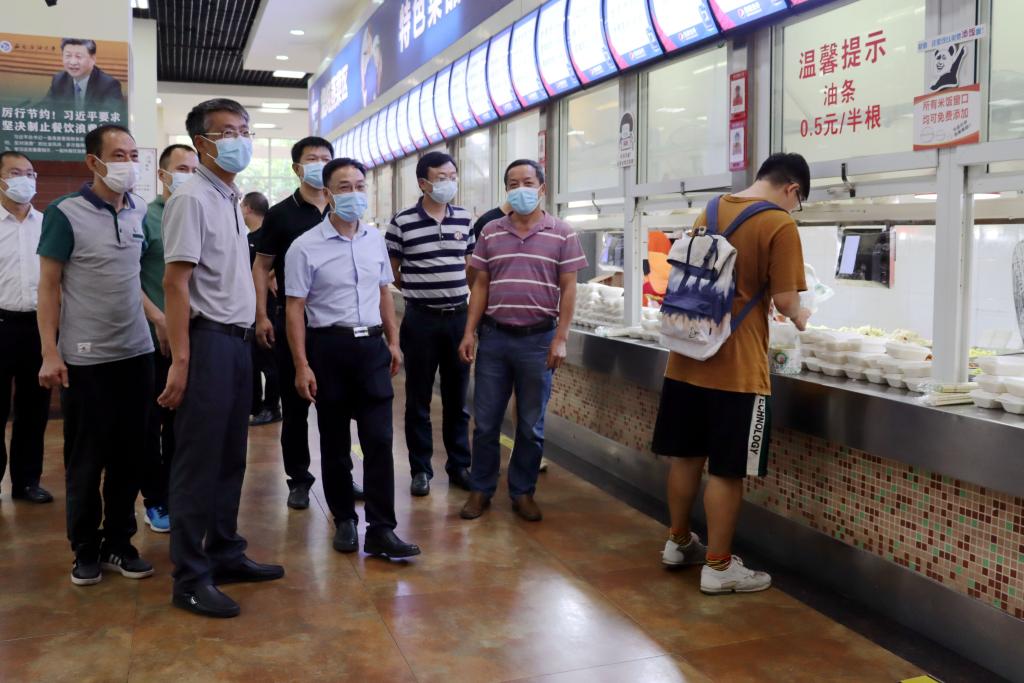 在教職工家屬區小西門,工作組聽取了有關教職工及家屬進出管控措施、臨時出入卡發放和生活物資保障等情況,叮囑現場工作人員要認真落實上級部門和學校疫情防控規定,堅決落實好門禁管理工作,減少人員流動。在校園核酸監測點,工作組檢查了校園核酸檢測現場準備情況,張烈輝慰問了現場醫務人員,他強調要按照“應檢必檢”的要求,堅決完成全員核酸檢測任務,確保不漏一人。在學生第二食堂,工作組詳細了解食堂飯菜供應和環境消毒情況,張烈輝叮囑后勤部門和食堂工作人員,學校取消堂食后,要確保飯菜供應和食品安全,督促學生隨買隨走,做到不聚集、不扎堆。
