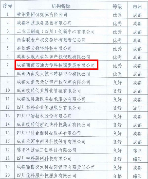 根據(jù)《四川省科學(xué)技術(shù)廳重大科技創(chuàng)新基地考核評(píng)估規(guī)程》等有關(guān)規(guī)定,科技廳開(kāi)展了2022年四川省技術(shù)轉(zhuǎn)移示范機(jī)構(gòu)考核評(píng)估工作。經(jīng)過(guò)機(jī)構(gòu)自評(píng)、專家評(píng)審、廳基地聯(lián)席會(huì)議審議、廳務(wù)會(huì)審議,確定全省80家技術(shù)轉(zhuǎn)移機(jī)構(gòu)(其中企業(yè)法人機(jī)構(gòu)40家)中的18家為優(yōu)秀,15家為良好,30家為合格,17家為不合格(其中6家取消資格)。40家企業(yè)法人技術(shù)轉(zhuǎn)移機(jī)構(gòu)中8家獲得優(yōu)秀。我校科技園是唯一獲得“優(yōu)秀”的高校科技園類技術(shù)轉(zhuǎn)移機(jī)構(gòu)。