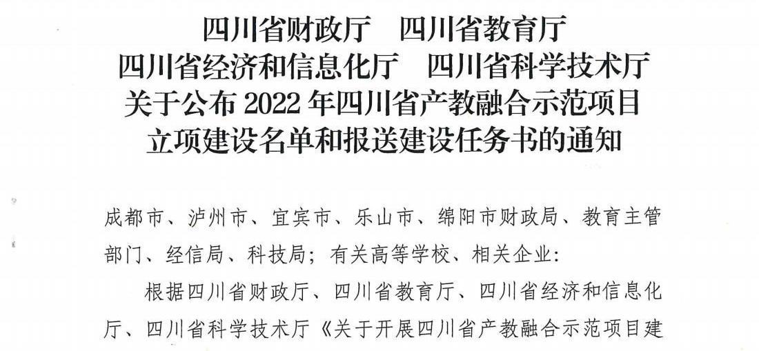 近日,四川省財政廳、四川省教育廳、四川省經濟和信息化廳、四川省科學技術廳發文公布了2022年四川省產教融合示范項目立項建設名單,我校與通威太陽能(成都)有限公司聯合申報的“四川省光伏產業產教融合綜合示范基地”獲批,省財政將給予項目5000萬元資助。
