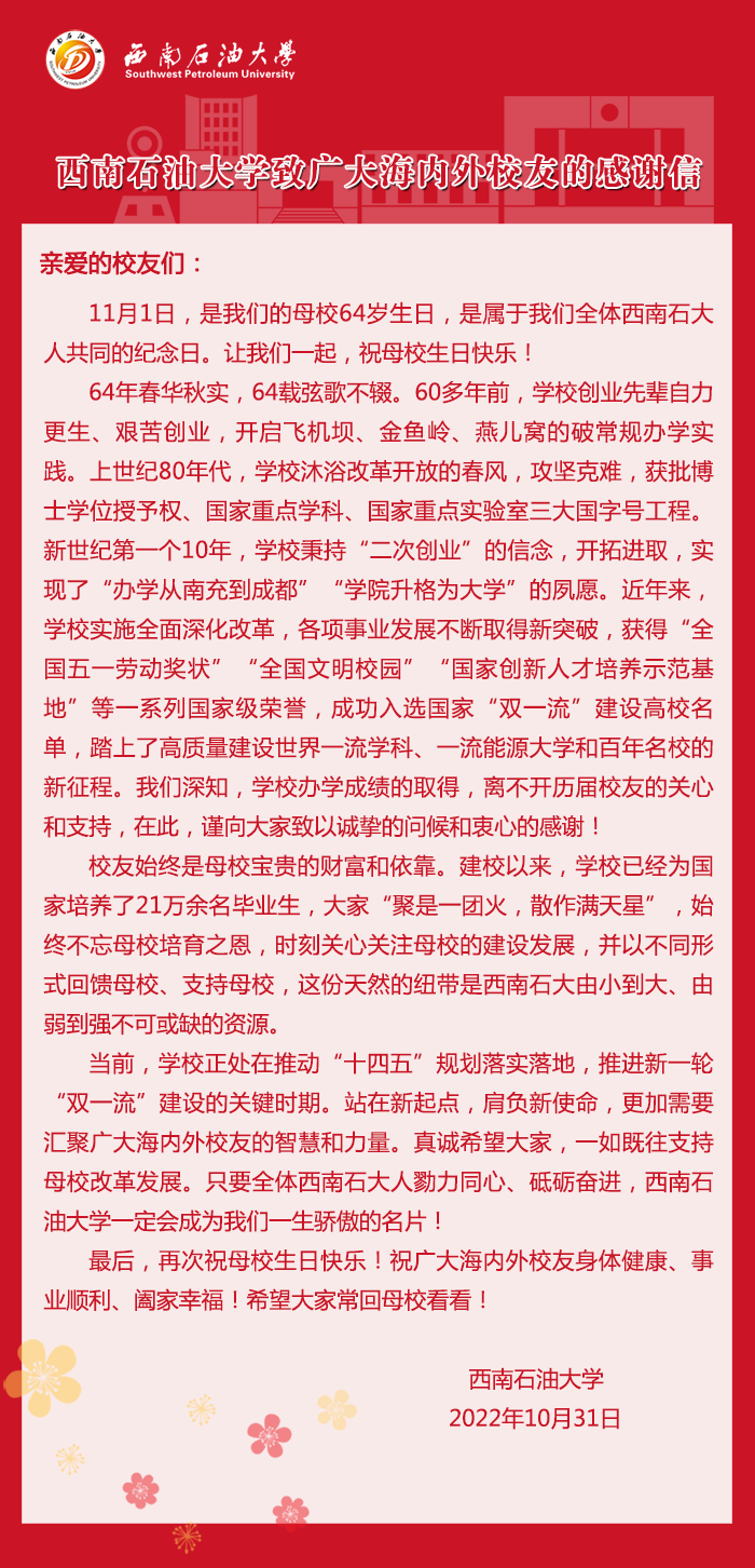 西南石油大學(xué)致廣大海內(nèi)外校友的感謝信