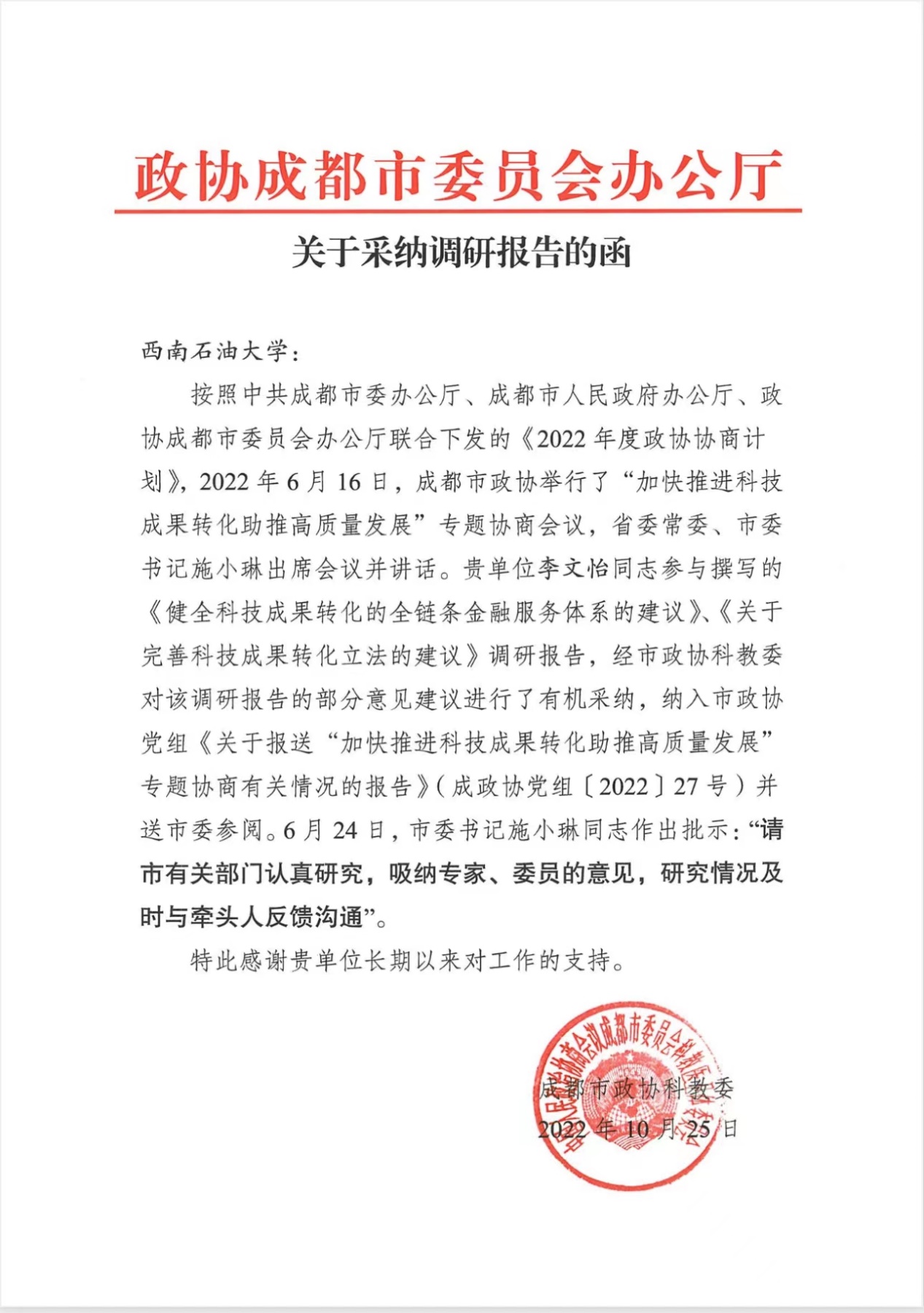 近日,政協成都市委員會辦公廳給我校發函,稱貴單位李文怡同志參與撰寫的《健全科技成果轉化的全鏈條金融服務體系的建議》《關于完善科技成果轉化立法的建議》兩份調研報告納入市政協黨組《關于報送“加快推進科技成果轉化助推高質量發展”專題協商有關情況的報告》報送市委參閱,中共四川省委常委、成都市委書記施小琳同志做出批示:請市有關部門認真研究,吸納專家意見。函件對我校給予成都市政協工作的支持表示感謝。