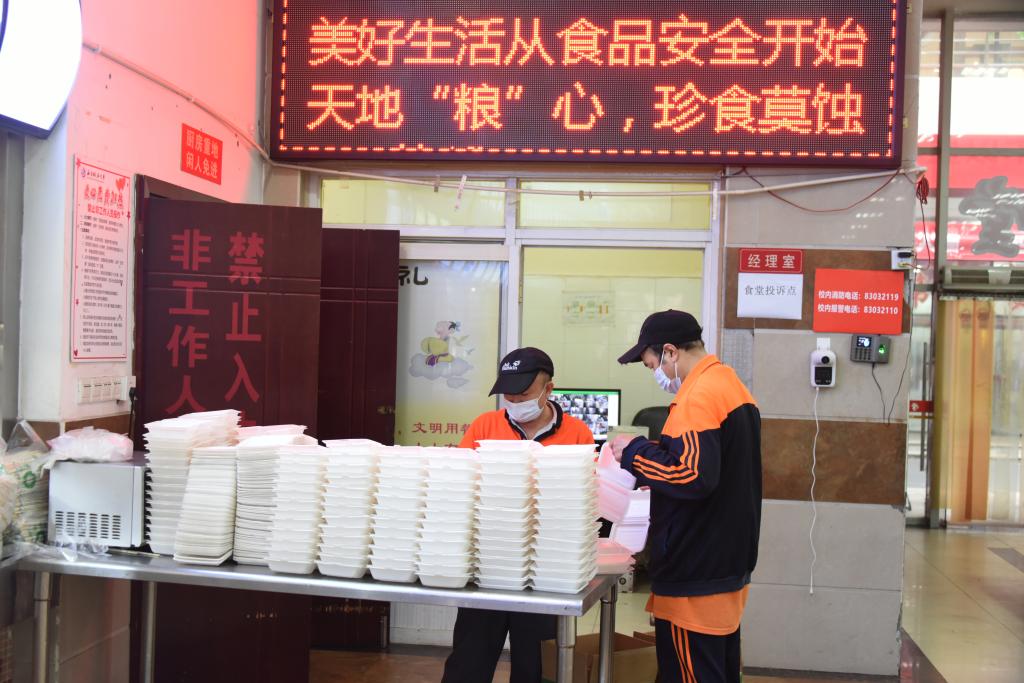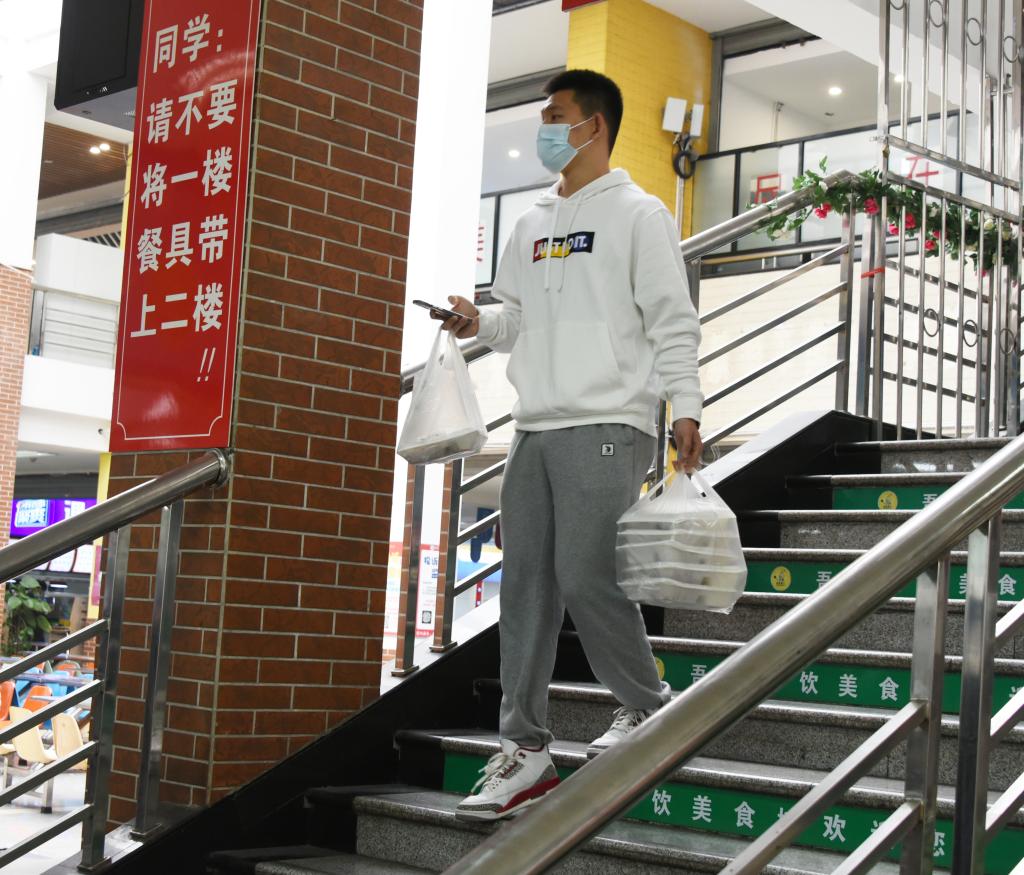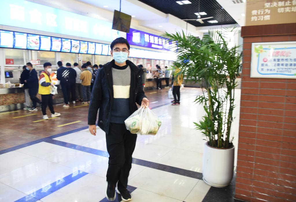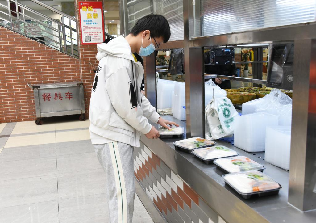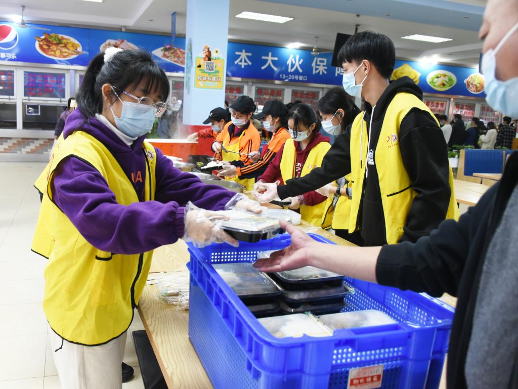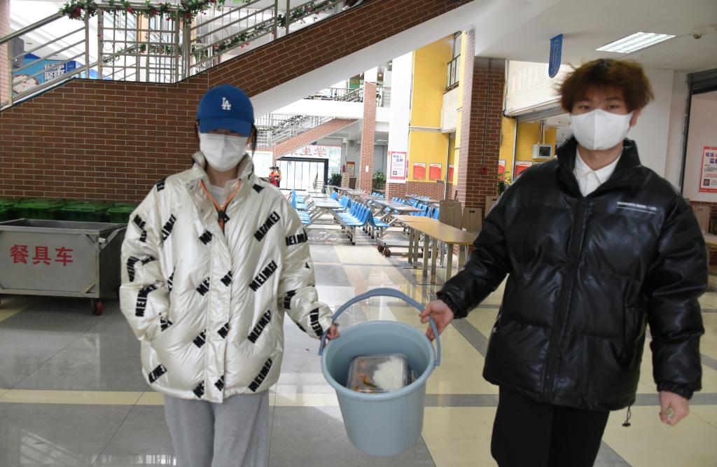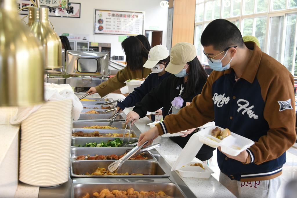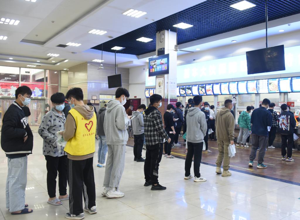 全體學生聽從安排、服從指揮,按時到核酸采樣點進行核酸采樣,確保“應檢盡檢”;在學校統籌安排下,分時段有序到食堂打包盒飯,或用提前準備的運餐工具相互協作將餐食運送回寢室,或用學校提供的餐盒和打包袋將餐食帶回寢室。