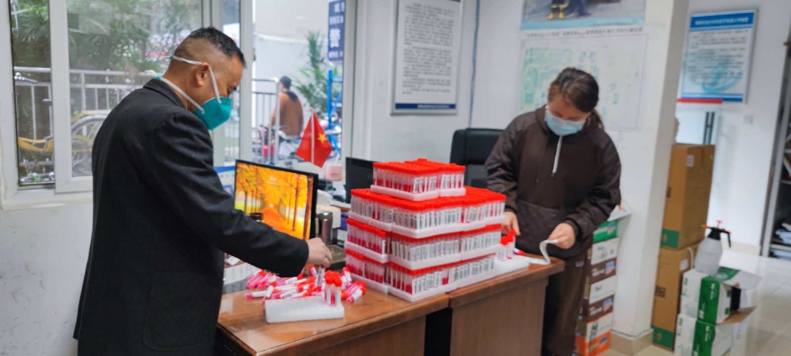 李仲貴和姬紅燕給核酸采樣管貼二維碼
