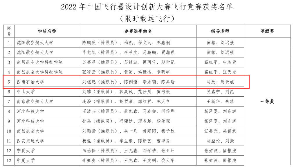 12月3日,2022年中國飛行器設(shè)計創(chuàng)新大賽組委會對大賽結(jié)果作出公示,西南石油大學(xué)航模隊在限時載運(yùn)飛行項目中以第五名的成績獲得全國一等獎。