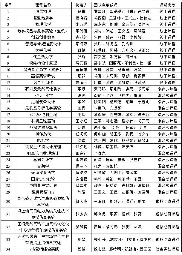 近年來,學校深入貫徹落實《教育部關于一流本科課程建設的實施意見》,制訂了《西南石油大學校級本科優質教學資源建設項目培育計劃》,構建了本科優質教學資源國家—省—校—院四級建設培育體系,截至目前,總共8門課程被認定為國家級一流本科課程,112門課程被認定為省級一流本科課程。