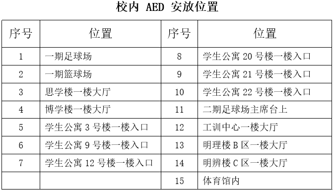 AED全稱自動體外除顫儀,又被稱作“救命神器”,是可被非專業(yè)人員使用的用于搶救心臟驟停患者的便攜式醫(yī)療設(shè)備。我校在推進(jìn)校園急救教育工作中,在師生主要活動區(qū)域配備了15臺AED。對全校師生開展了急救教育培訓(xùn),對重點人群(體育老師、輔導(dǎo)員、各單位職工代表等)進(jìn)行了紅十字救護(hù)員培訓(xùn)并取得紅十字救護(hù)員證。隨著校園內(nèi)AED安裝到位,校醫(yī)院將加大AED投放位置宣傳,對各點位責(zé)任人及校內(nèi)師生進(jìn)行AED操作培訓(xùn),實現(xiàn)校園內(nèi)突發(fā)急救狀況時知道就近的AED位置,拿到AED會用、敢用,人人學(xué)急救、人人會急救。