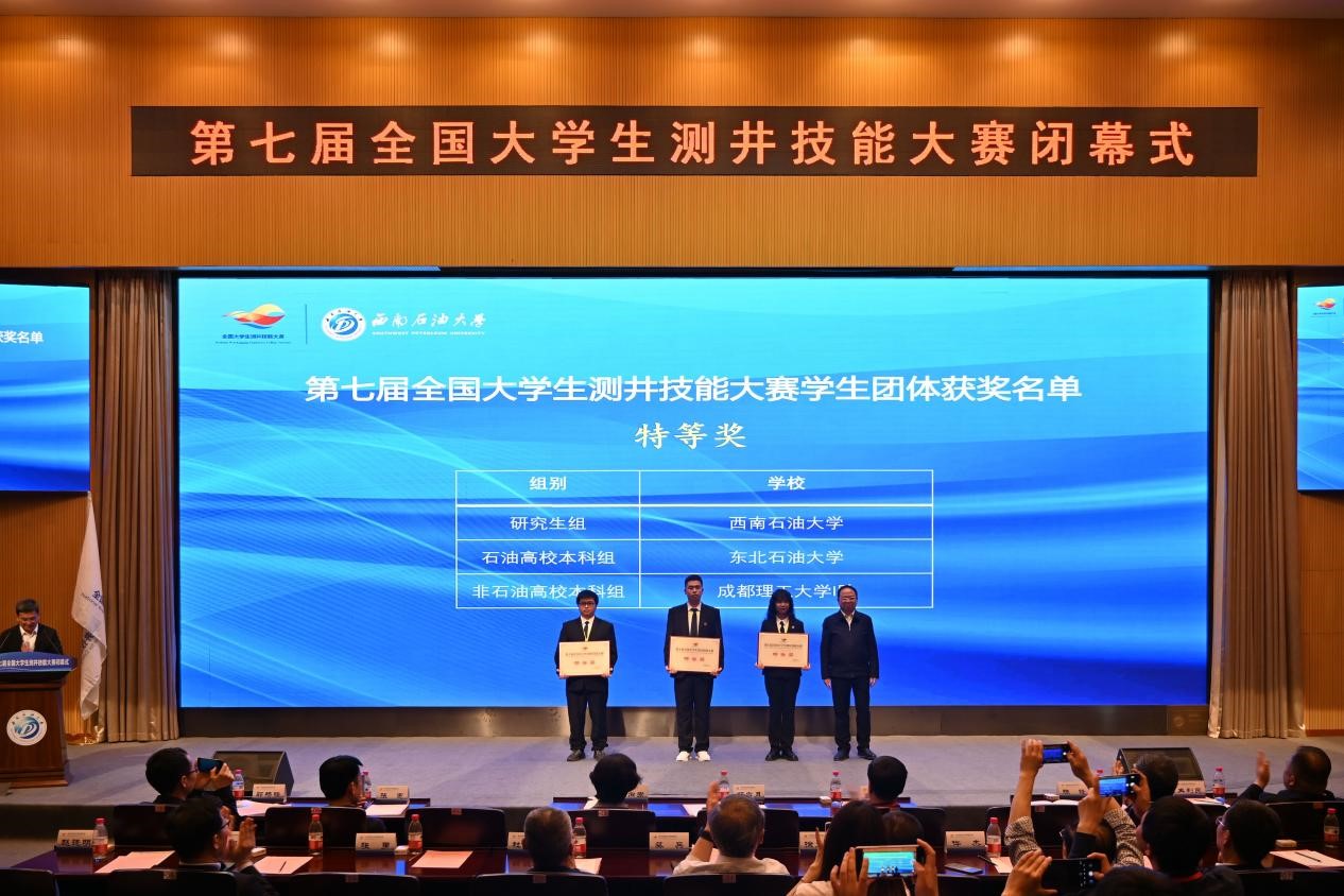 中國石油學(xué)會測井專業(yè)委員會主任、中國石油集團測井有限公司總經(jīng)理胡啟月,東北石油大學(xué)黨委副書記高洪峰,中國石油學(xué)會測井專業(yè)委員會秘書長張辛耘,西南石油大學(xué)黨委常委、副校長劉向君出席,中石油、中海油、中石化等石油企業(yè)領(lǐng)導(dǎo)專家、各高校參賽代表參加閉幕式。閉幕式由地球科學(xué)與技術(shù)學(xué)院黨委副書記趙曉明主持。