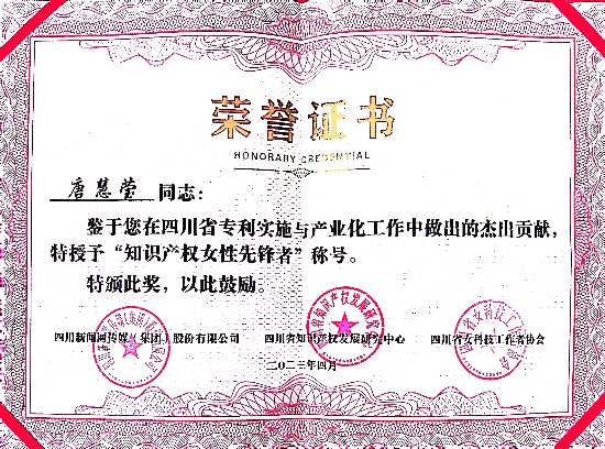 “知識產權女性先鋒者”由四川省新聞網、四川省知識產權發展研究中心聯合頒發,四川省總共有11名女性獲此殊榮。