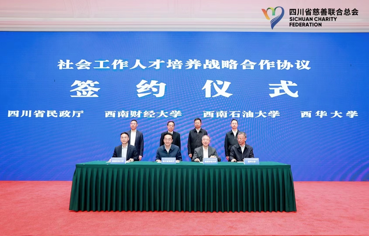 5月12日上午,在成都召開的“512”汶川特大地震15周年慈善感恩座談會上,民政部原副部長、中華慈善總會會長宮蒲光,四川省人民政府副省長段毅君,四川省民政廳黨組成員、副廳長廖永康,四川省民政廳黨組成員、副廳長胡建林等領導,以及來自全國20個相關慈善支援省(市)民政廳(局)、慈善會(基金會)的代表,共同見證了四川省民政廳與西南財經大學、西南石油大學、西華大學四方戰略合作協議簽字儀式。