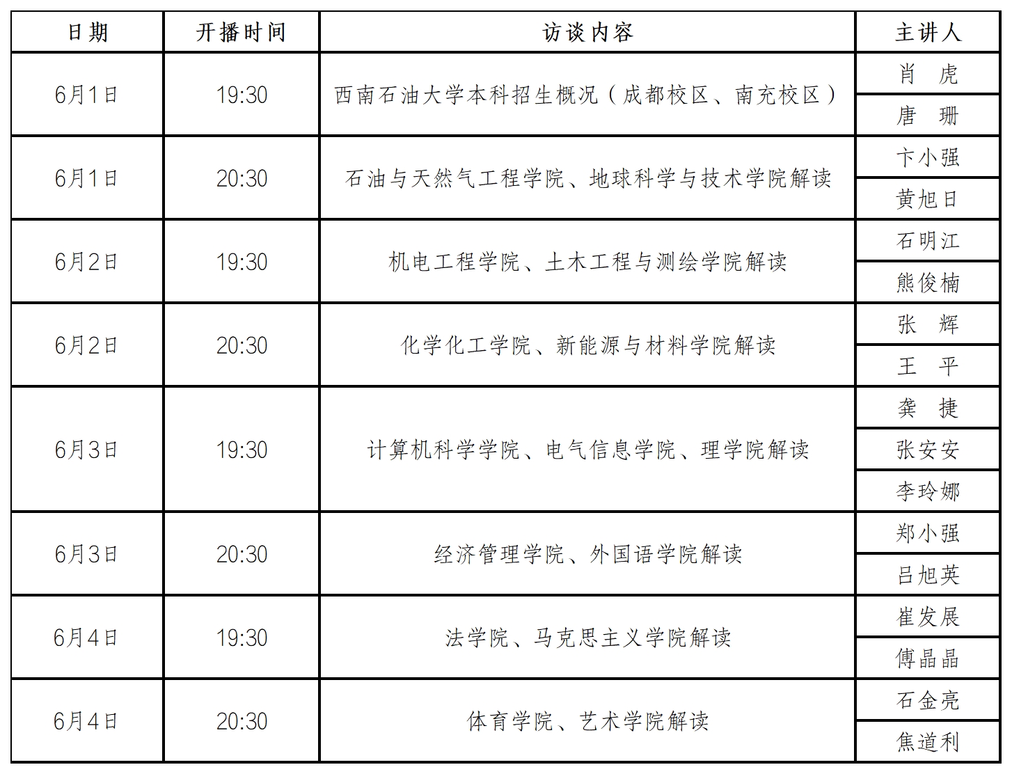 2023年高考在即,西南石油大學(xué)兩個(gè)校區(qū)17個(gè)單位共計(jì)17位主講老師,于6月1日-4日通過(guò)線(xiàn)上訪(fǎng)談的形式持續(xù)對(duì)話(huà)廣大考生及家長(zhǎng),幫助考生和家長(zhǎng)了解西南石油大學(xué)整體情況、招生政策、各學(xué)院人才培養(yǎng)優(yōu)勢(shì)及特色、畢業(yè)生就業(yè)及深造等情況,具體安排如下: