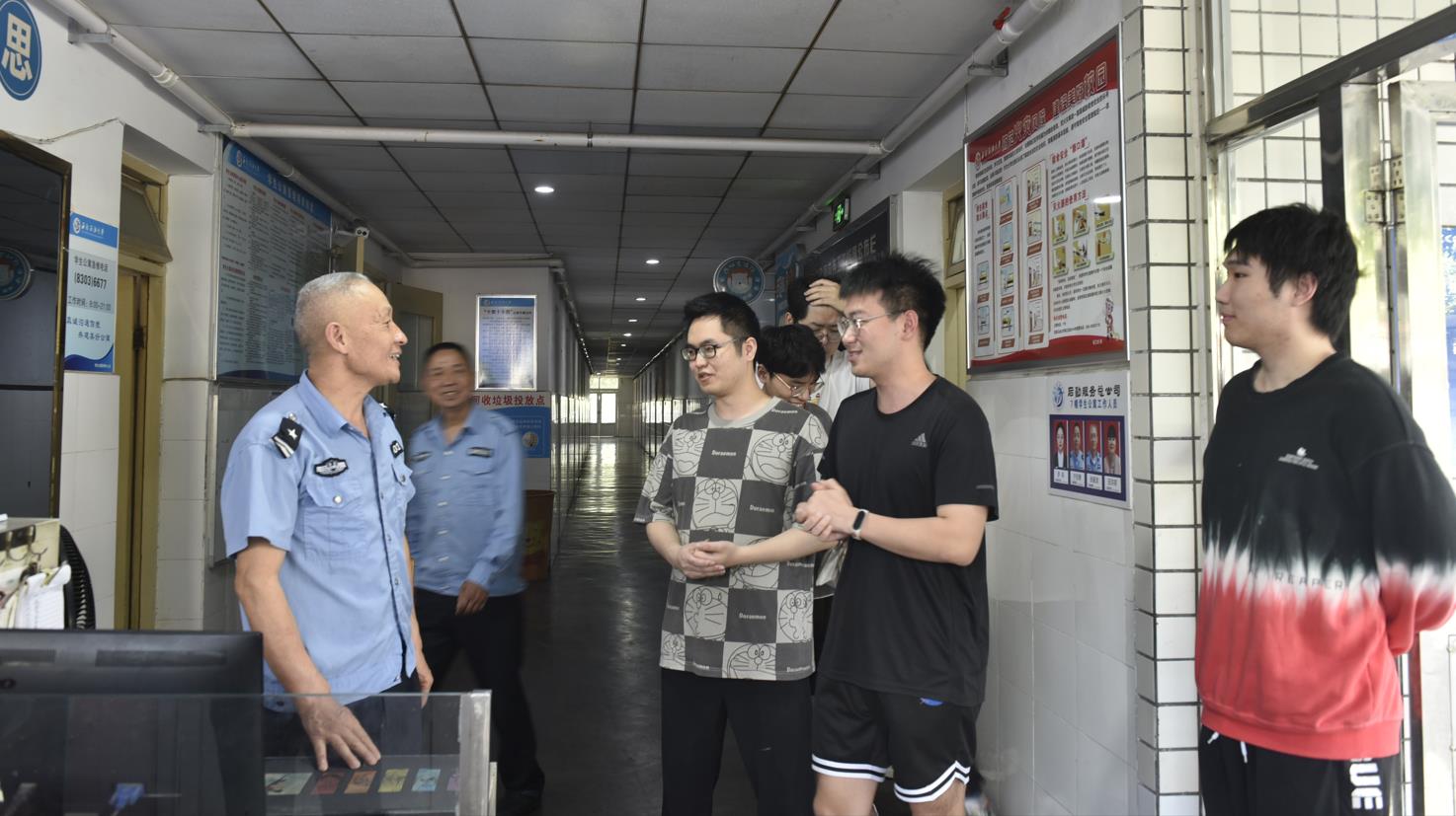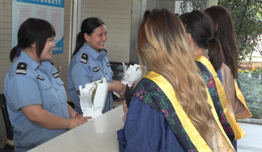 在學生公寓22棟,計科院剛參加完畢業(yè)合影一群女生,穿著學位服來到門崗,把鮮花送到宿管手上。當班的是兩位年輕宿管,她們心里樂開了花。王曉林說:“我和你們年齡差不多,但我是宿管,你們是大學生,真羨慕你們,也后悔當時我沒有好好讀書。”計算機技術(shù)2020級研究生蔣宏霞說:“感謝老師們的服務,我們在這里很有安全感。”甘國茂說:“感謝同學們的理解。女生自我防護能力差,對宿舍管得比較嚴。希望同學們一生都平平安安。”計科院的一群男生則來到學生公寓13棟,與宿管照了一張合影,并把照片裝入電子相冊,掛在門衛(wèi)室。宿管蔣世川說:“這么多年來,我天天守著你們,今天終于照了一張合影,很難得,很珍貴。”