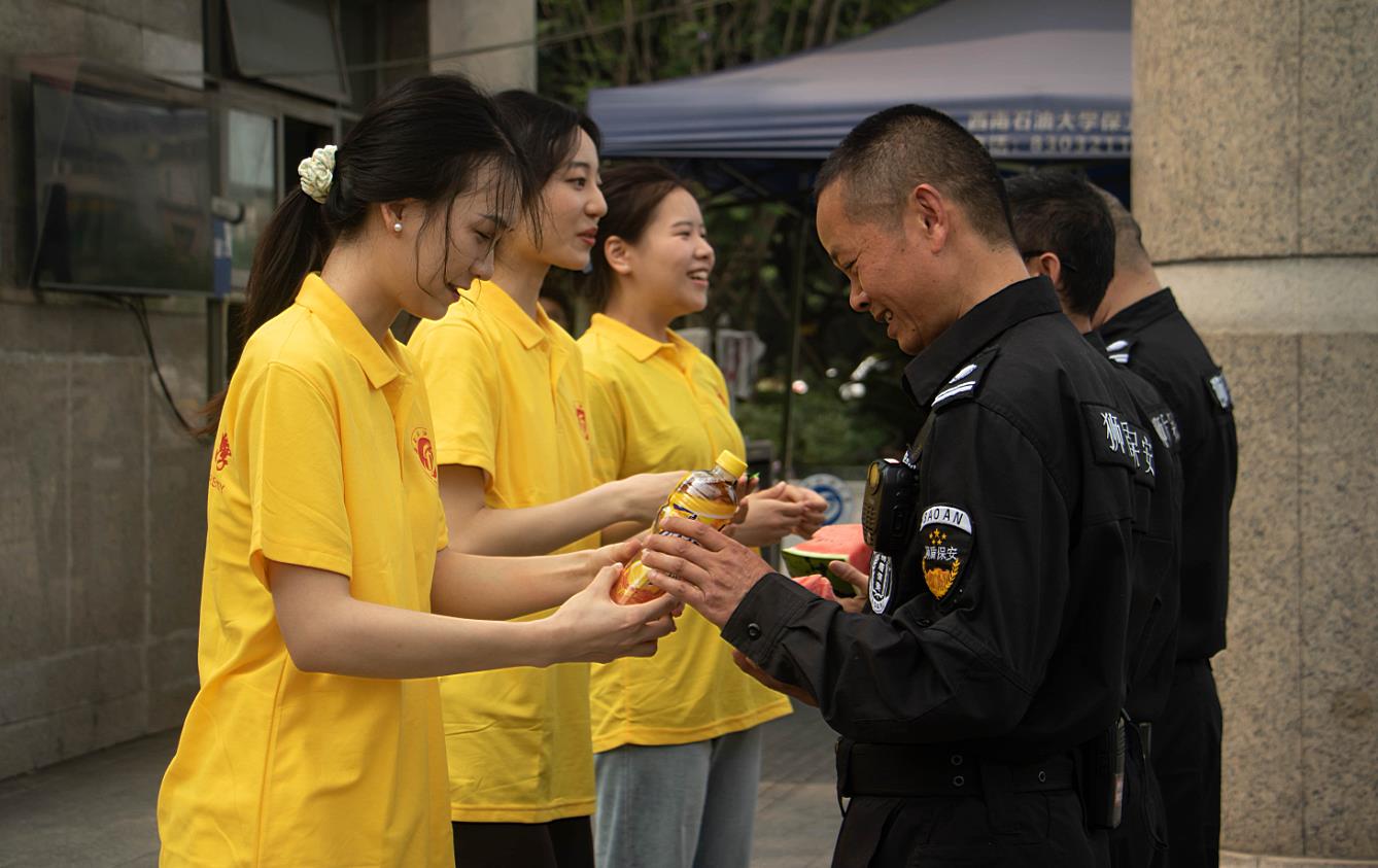 外語院的一群女生來到南大門,給保安送來西瓜、冰紅茶,又一起合影、座談。英語專業(yè)的樊莉莎同學說:“我們每天在這里進進出出,卻叫不出你們的名字。這幾年你們很辛苦,但我們會記得你們的,希望老師們保重身體。”保安隊長羅壽平說:“守衛(wèi)幾萬人的校園,安全責任重如山。你們在這里平平安安地度過了四年,這是最讓人欣慰的。希望你們常回來看看。”英語專業(yè)的楊博雅說:“我們下次回來的時候,再來看望你們。”臨別時,保安還告訴同學們,下次回來時怎么辦理校友卡。“有了校友卡,同學們進校就方便多了。”羅壽平說。