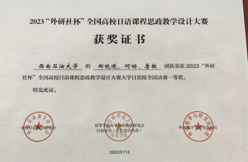 2023“外研社杯”全國高校日語學科課程思政教學設計大賽(大學日語組)獲獎名單近日公布,我校外國語學院教師郝曉曦團隊(郝曉曦、何姍、唐敏)喜獲全國決賽一等獎。