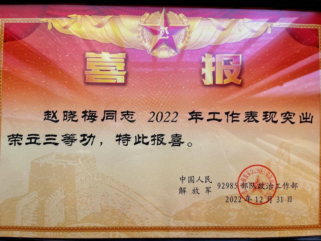 近日,學校武裝部收到中國人民解放軍某部發來的喜報,報告我校2017屆應征入伍的畢業生趙曉梅榮立三等功、獲得2022年度“四有”優秀軍官。
